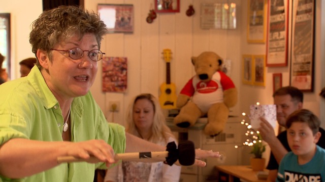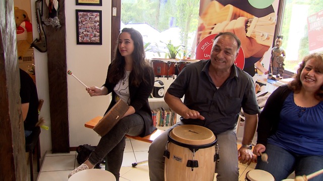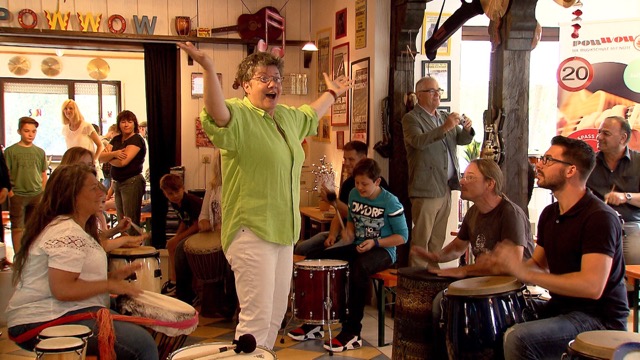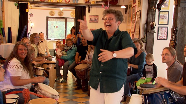 So gelang es ihr mit wenigen Handzeichen und einer ausdrucksstarken Mimik die trommelnde Gruppe mitzureißen und auf einen gemeinsamen Groove einzustimmen. Vom zart entflammenden Crescendo bis hin zum explodierenden Trommelwirbel - vom Säugling bis zum Senior- alle ließen sich ganz auf die harmonisierende und vitalisierende Wirkung der rhythmischen Schwingungen ein.
